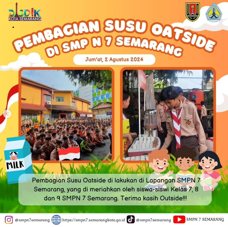Kegiatan ini diikuti Oleh Seluruh Siswa-Siswi SMP Negeri 7 Semarang pada hari Jumat, 2 Agustus 2024. Kegiatan ini bertujuan agar Siswa-Siswi terbiasa meminum susu di pagi hari guna mangawali sekolah. Mari kita jaga kesehatan bersama demi masa depan yang lebih baik