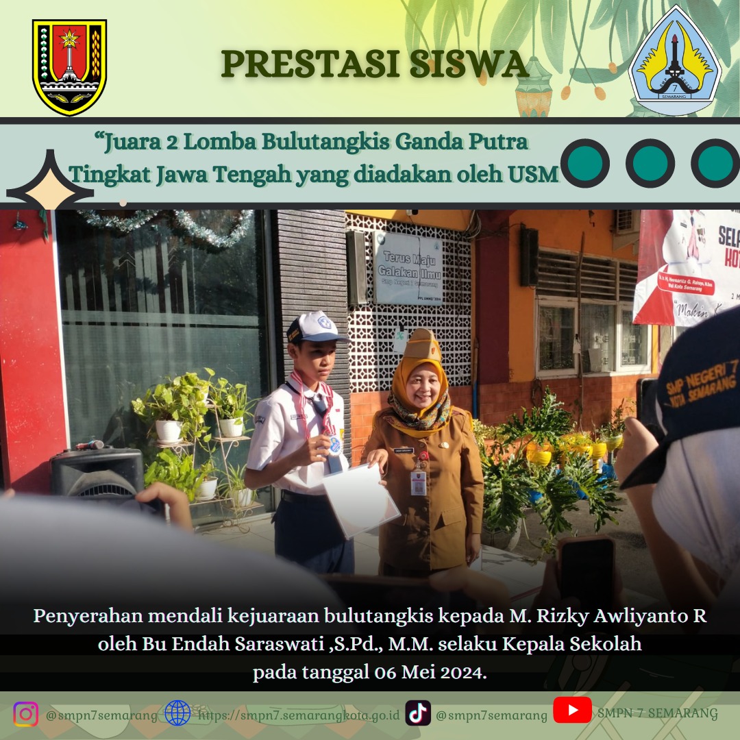 Salah satu siswa kami atas nama Muhammad Rizki Awliyanto (7D) dalam kejuaraan bulutangkis Piala Rektor USM 2024 mendapat juara 2 Ganda Putra. Spentura Jaya !!! Spentura Jaya !!! Spentura Yes, Aku Bisa !!