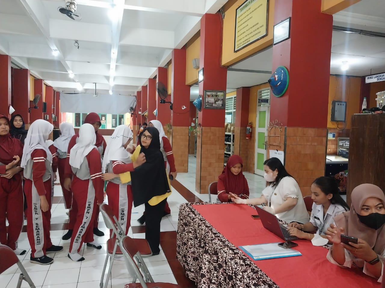 Sebelum pelaksanaan pemeriksaan, seluruh siswa kelas VIII dan IX berkumpul di lapangan SMP Negeri 7 Semarang untuk mendengarkan edukasi kesehatan dari pihak Puskesmas Poncol. Edukasi tersebut mencakup cara-cara mencegah berbagai penyakit, mengenali ciri-ciri penyakit, serta informasi penting lainnya yang mendukung siswa untuk menjaga kesehatan mereka dengan baik.